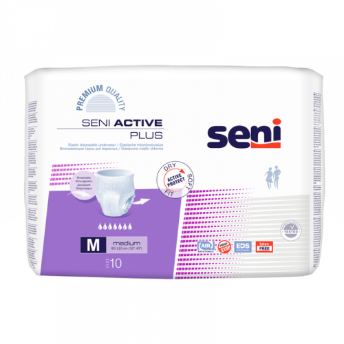 Die atmungsaktiven Inkontinenzslips SENI Active Plus können wie herkömmliche Unterwäsche angezogen und getragen werden. Sie sind die optimale Lösung für aktive Menschen, die Wert auf Diskretion und Komfort legen. Auf der Außenseite des Produktes befindet sich ein Nässeindikator, der über den Wechselbedarf informiert.